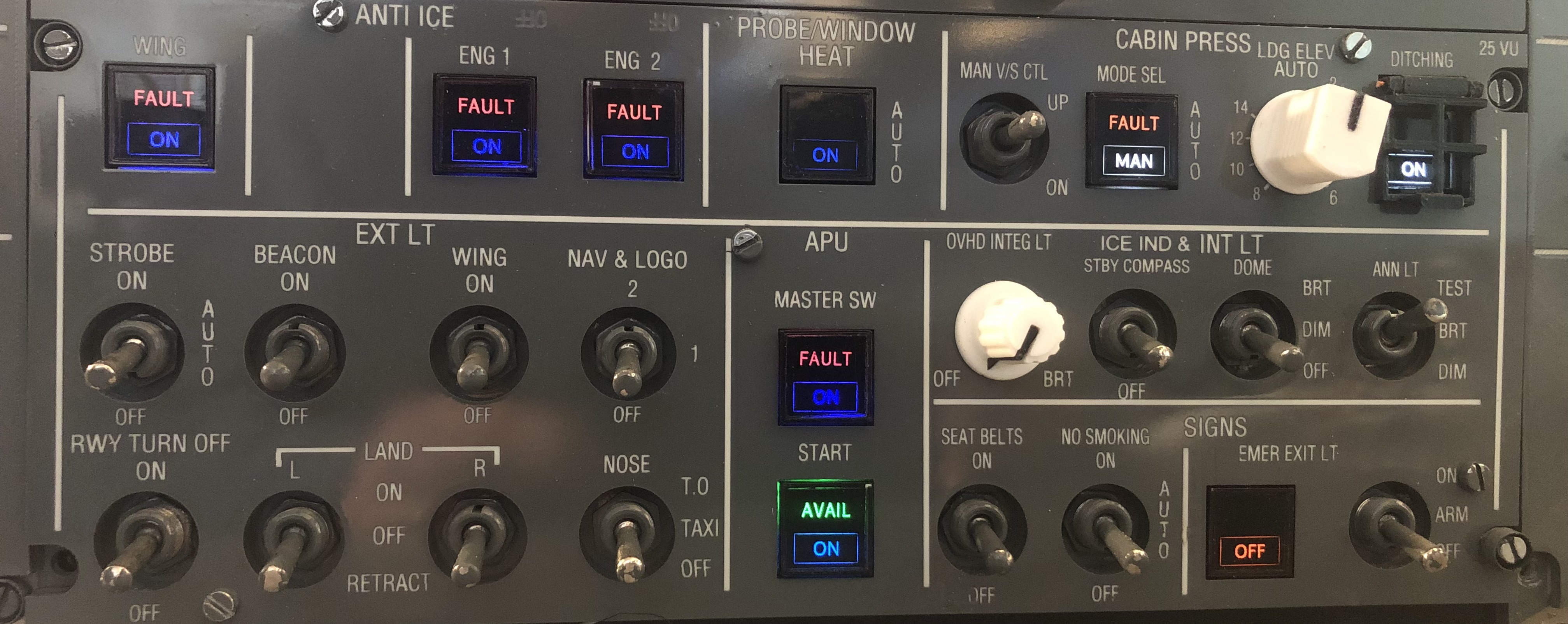 Le Light Panel sur l’Overhead sert à contrôler l’éclairage interne du cockpit, les annonceurs visuels et les éclairages externes de l’avion (navigation, anticollision, phares au sol, etc.).