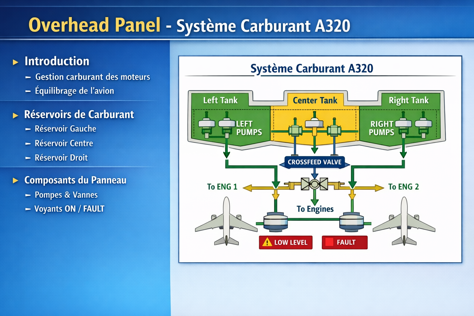 - Crossfeed Valve : permet de connecter réservoirs gauche/droite pour équilibrage ou panne moteur.